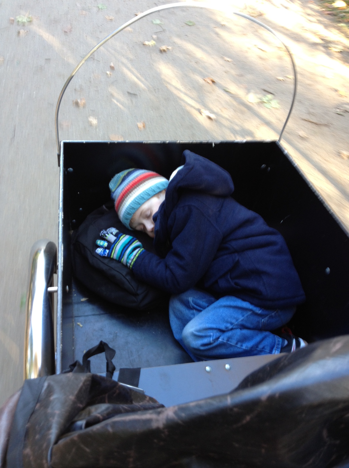 Nephew Daniel asleep in my hired Christiania